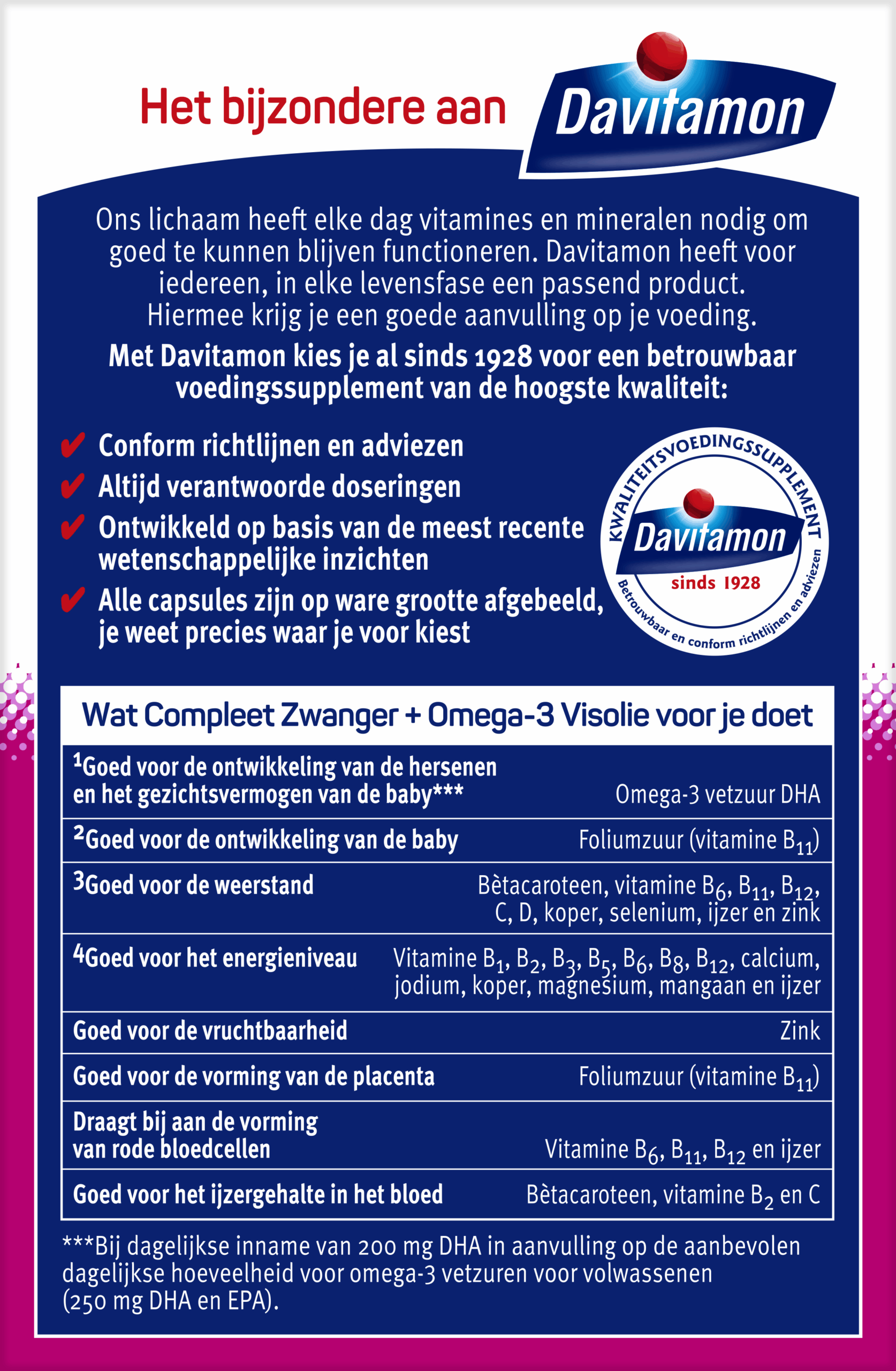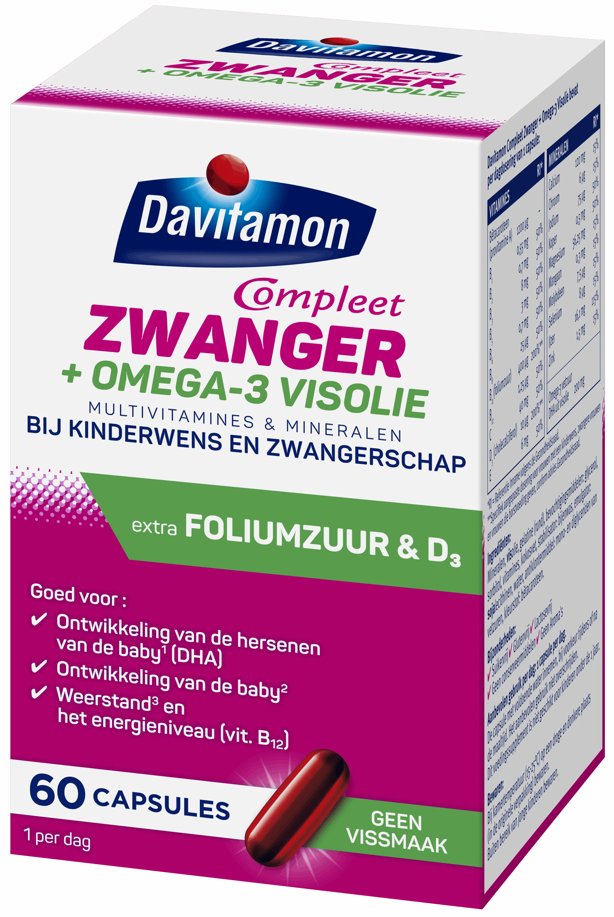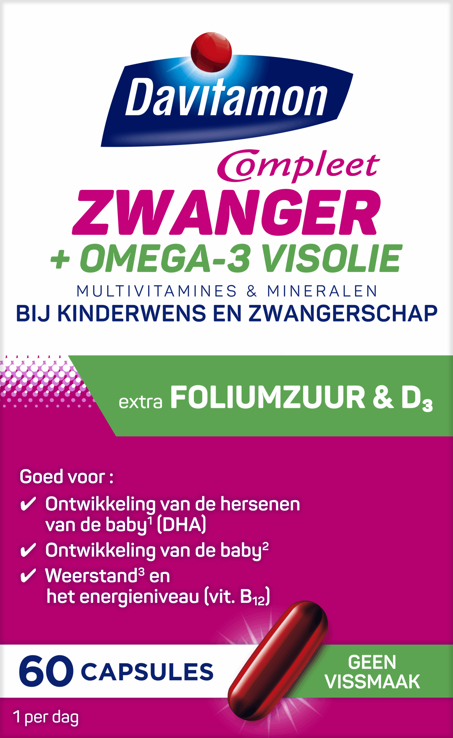 Speciaal voor vrouwen die zwanger willen worden, zwanger zijn of borstvoeding geven, worden in Davitamon Compleet Zwanger Omega-3 Visolie (voorheen Davitamon Compleet Mama Omega-3 Visolie) vitamines, mineralen en visolie gecombineerd in één capsule per dag. De samenstelling is zorgvuldig geselecteerd en bevat naast vitamines en mineralen extra foliumzuur, vitamine D3 en omega-3 vetzuur DHA. Voor en tijdens de zwangerschap is foliumzuur een verhoogde behoefte door de vorming van rode bloedcellen en de placenta.