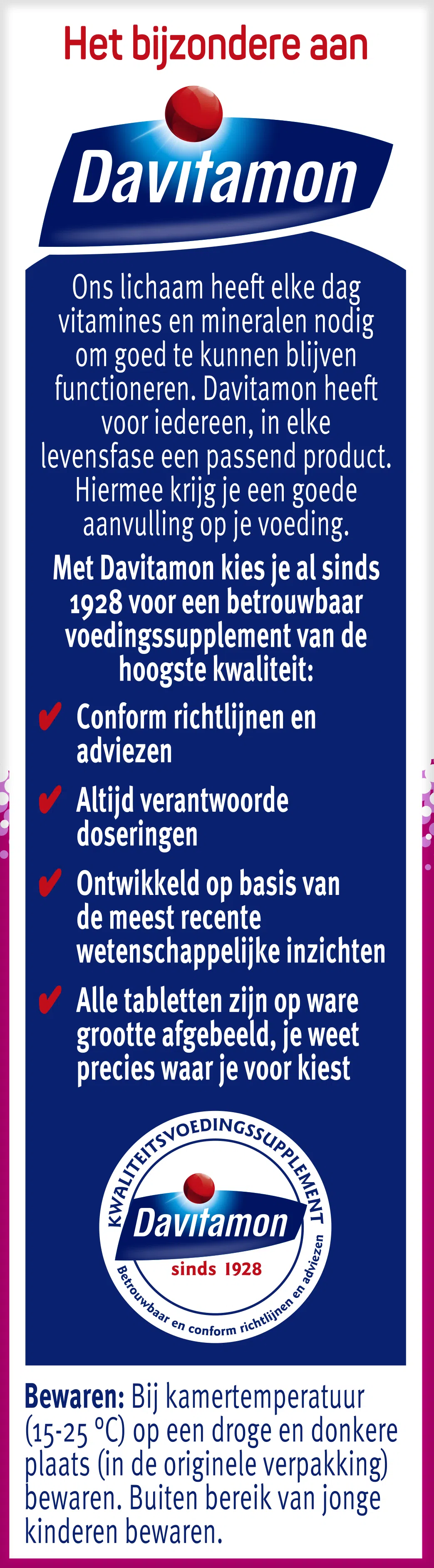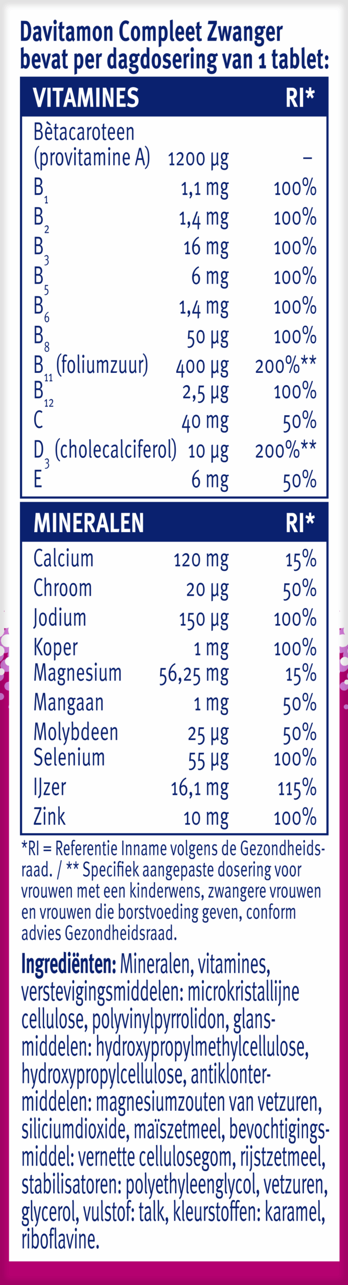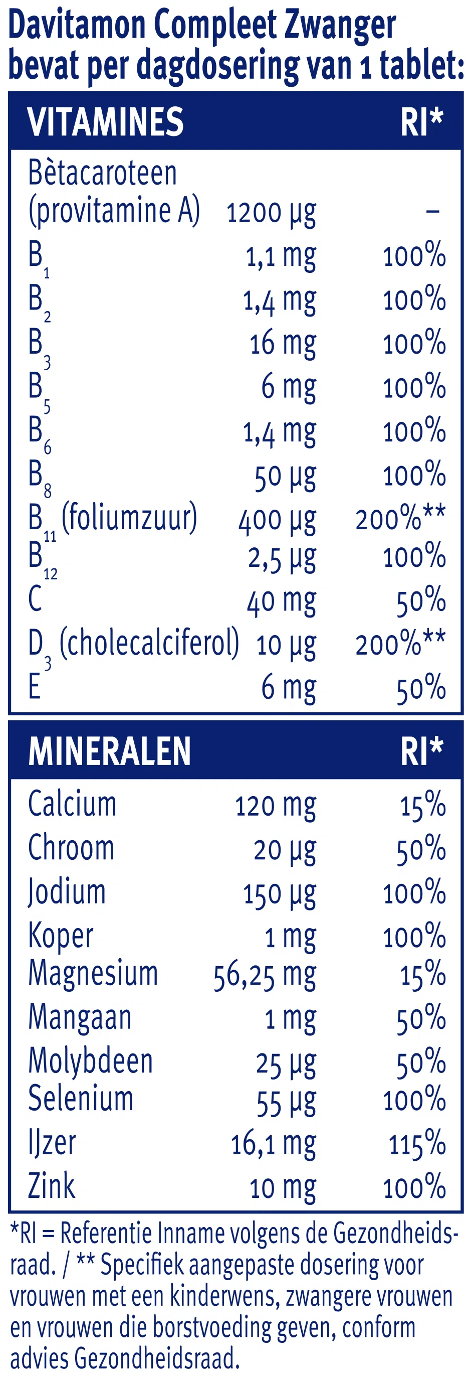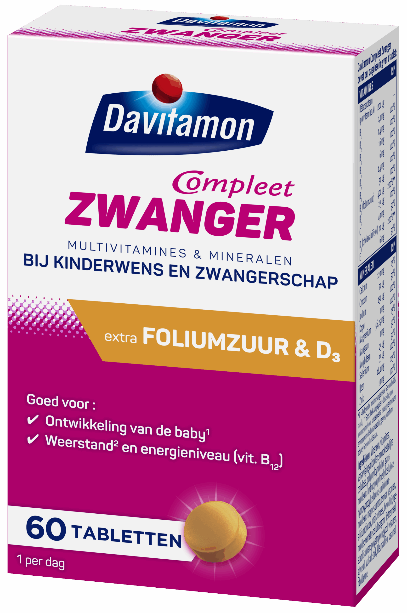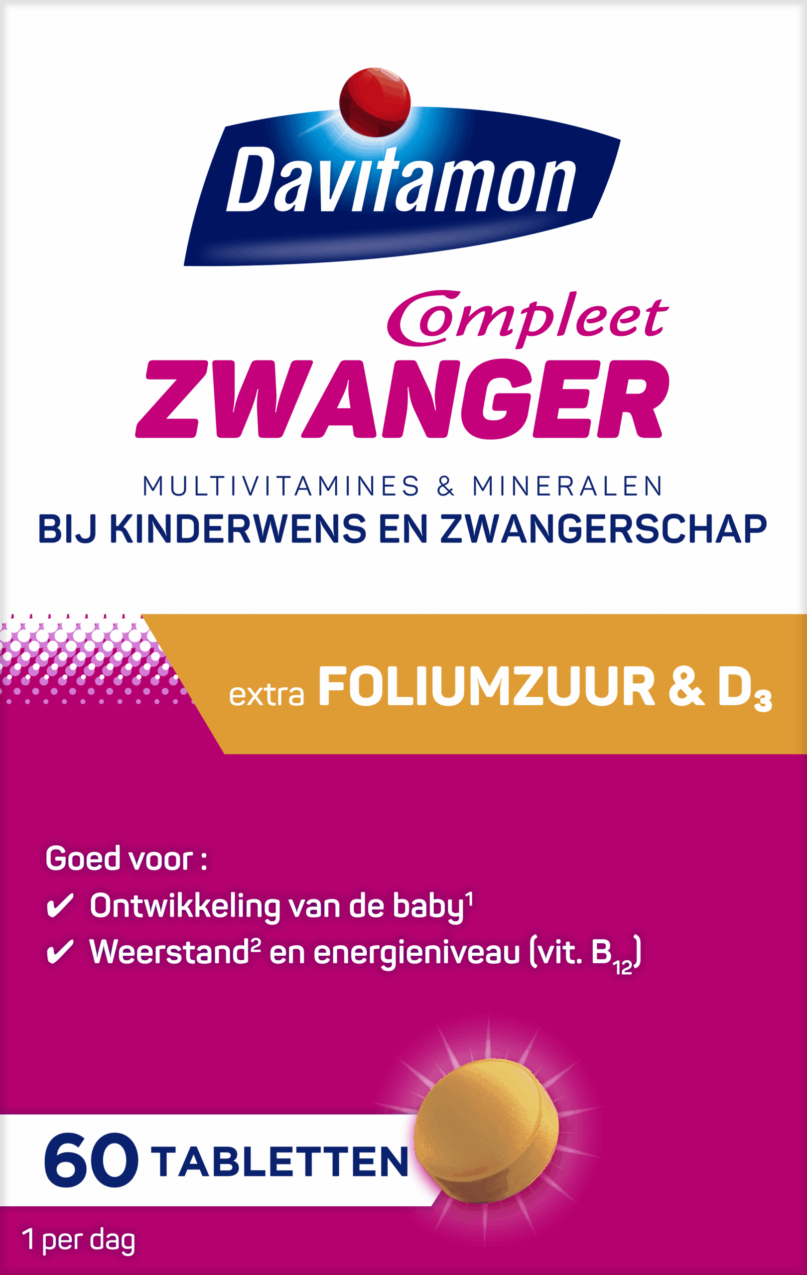 Davitamon Compleet Zwanger (voorheen Davitamon Compleet Mama) is een combinatie van vitamines en mineralen en bevat onder andere extra foliumzuur en vitamine D3. Tijdens de zwangerschap is foliumzuur belangrijk. Daarnaast is vitamine D tijdens de zwangerschap ook een belangrijke vitamine. Davitamon Compleet Zwanger is een complete aanvulling op je voeding en speciaal afgestemd op de behoefte van jouw lichaam als aanstaande moeder.