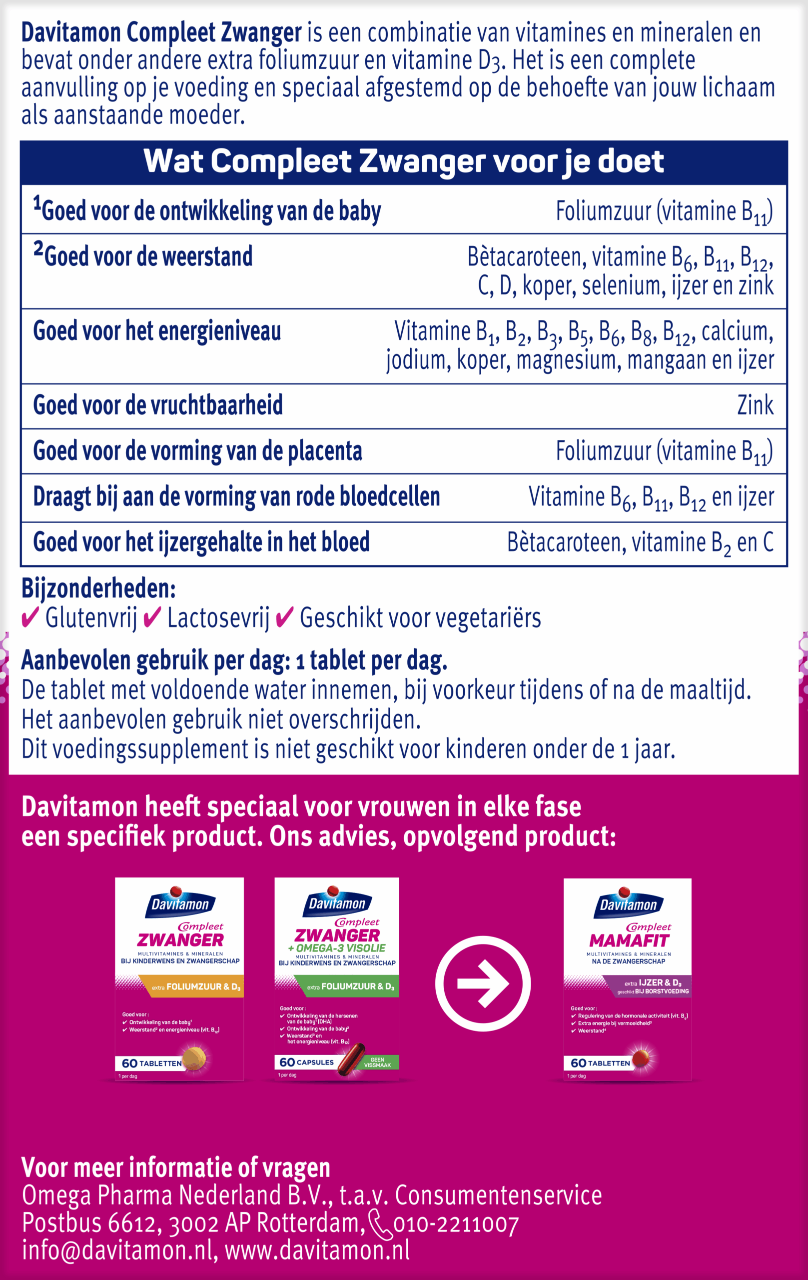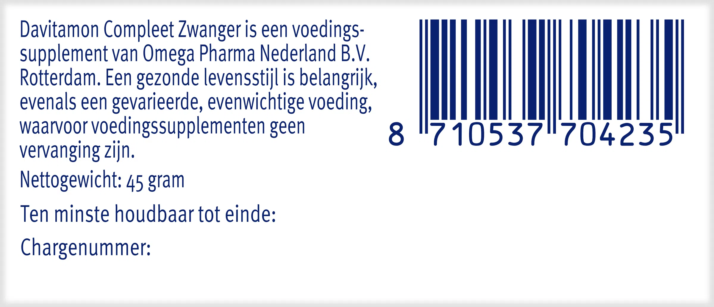 Davitamon Compleet Zwanger is een voedingssupplement van Omega Pharma Nederland B.V. Rotterdam. Een gezonde levensstijl is belangrijk, evenals een gevarieerde, evenwichtige voeding, waarvoor voedingssupplementen geen vervanging zijn. Dit voedingssupplement is niet geschikt voor kinderen onder de 1 jaar.