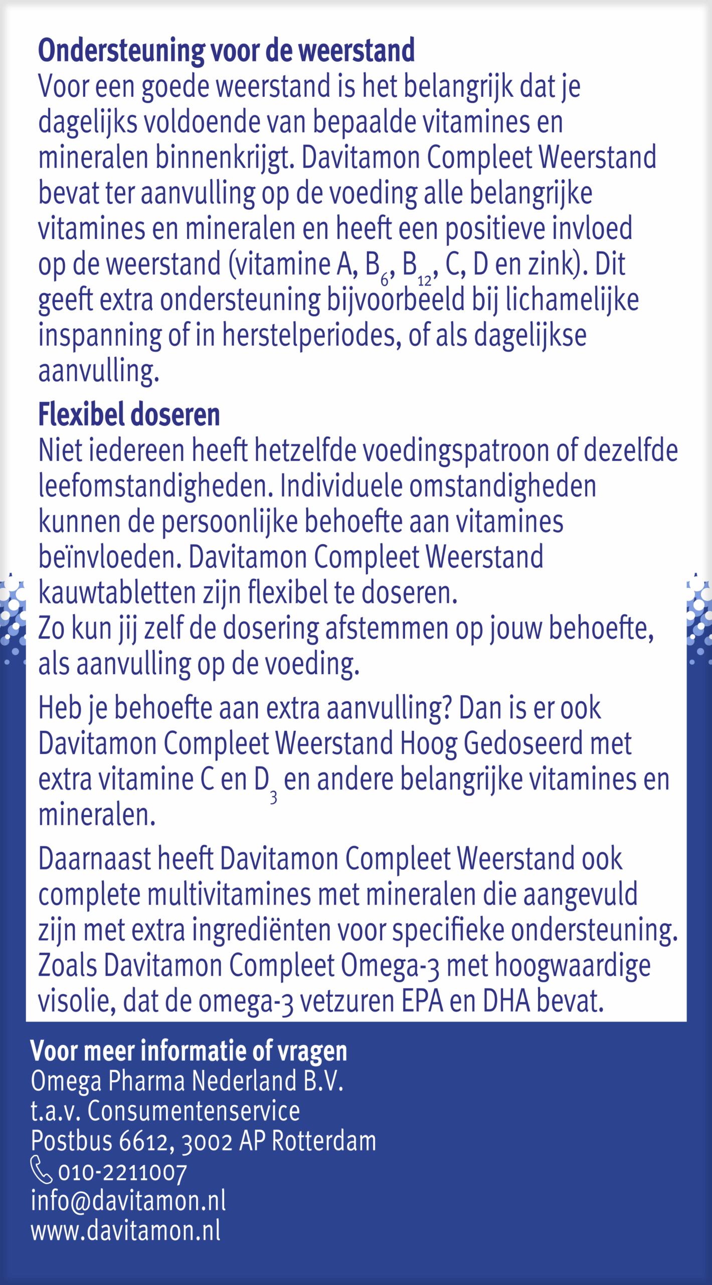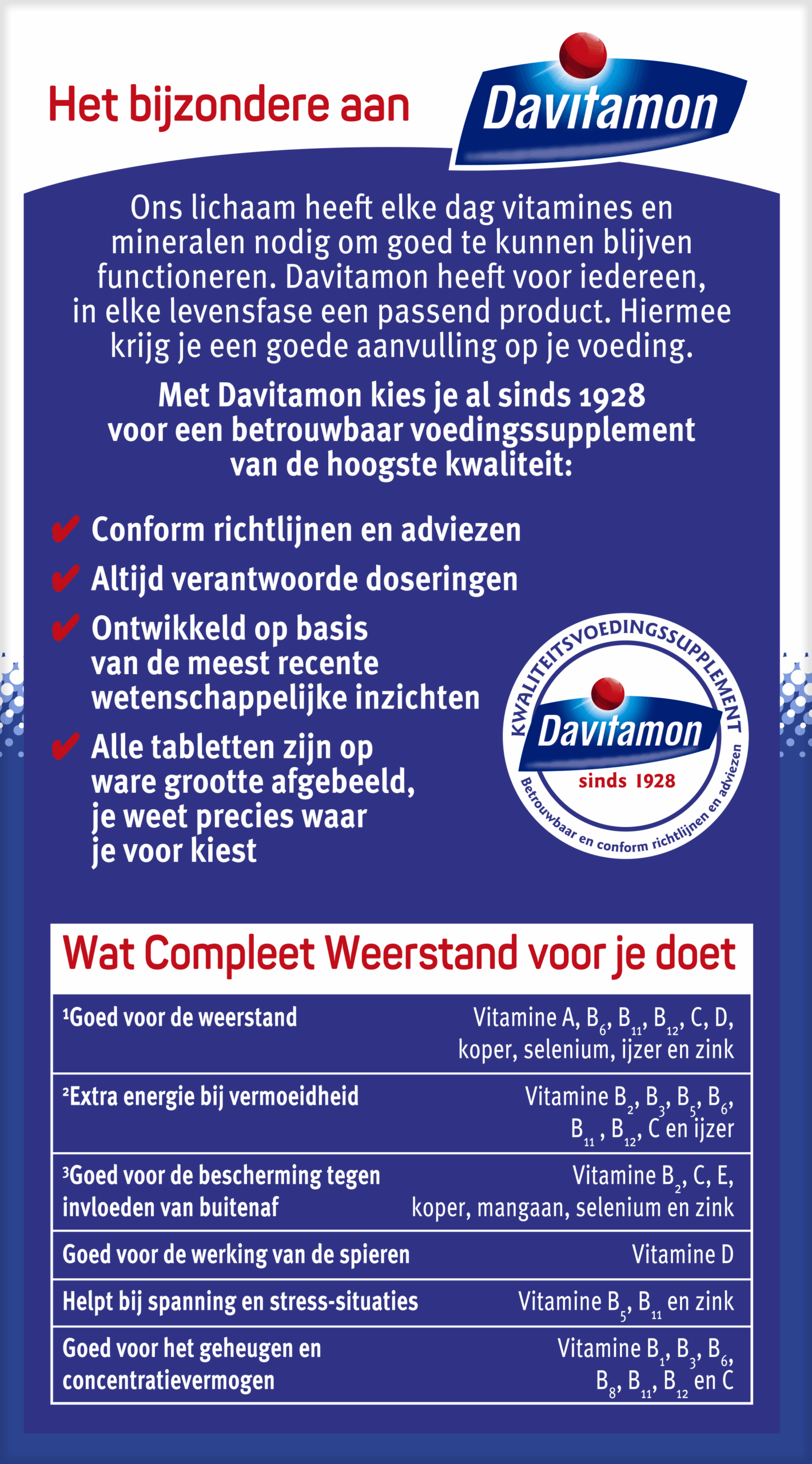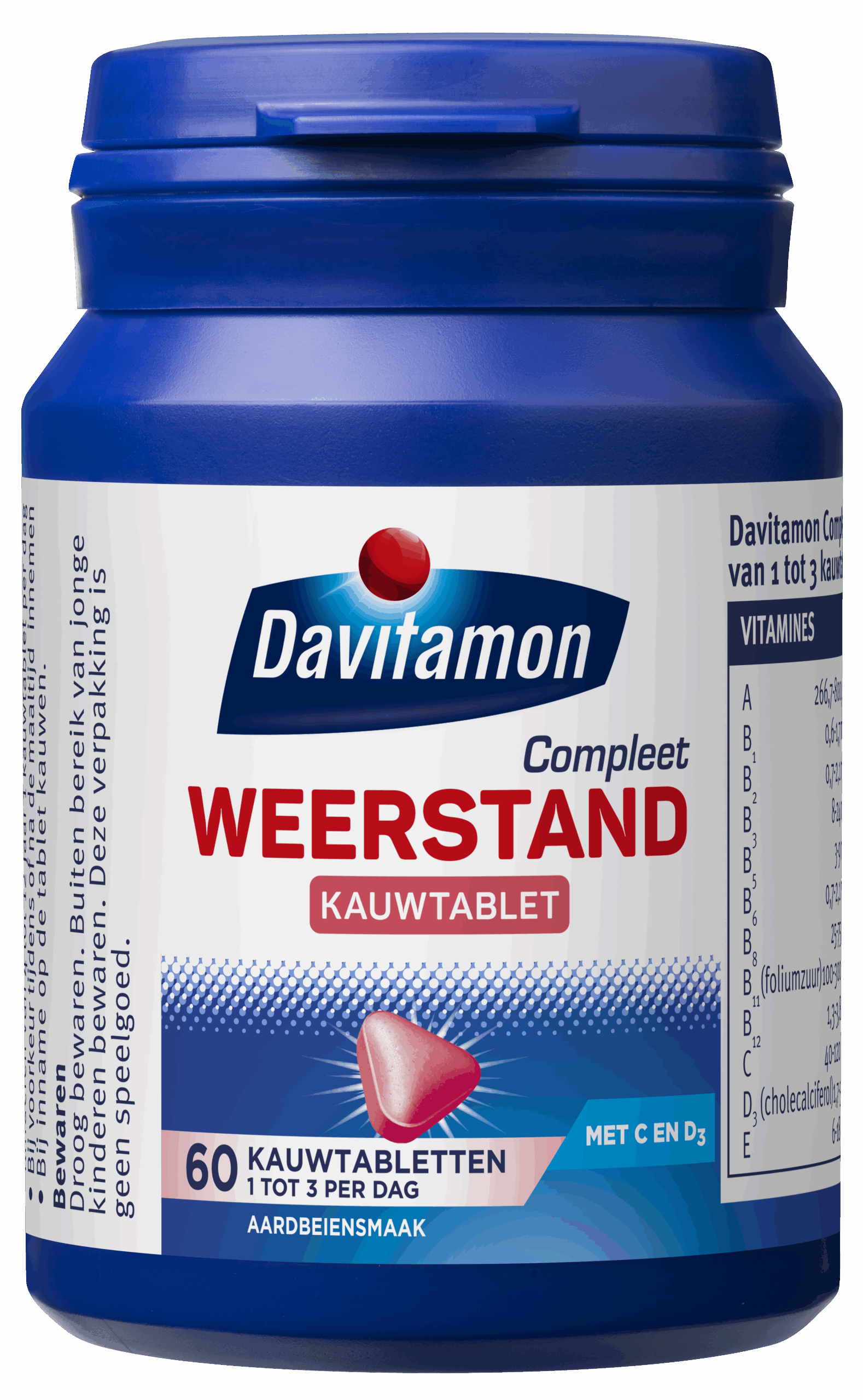 Davitamon Compleet Weerstand is een voedingssupplement met zoetstoffen van Omega Pharma Nederland B.V. Rotterdam. Een gezonde levensstijl is belangrijk, evenals een gevarieerde, evenwichtige voeding, waarvoor voedingssupplementen geen vervanging zijn. Dit voedingssupplement is niet geschikt voor kinderen tot en met 3 jaar.