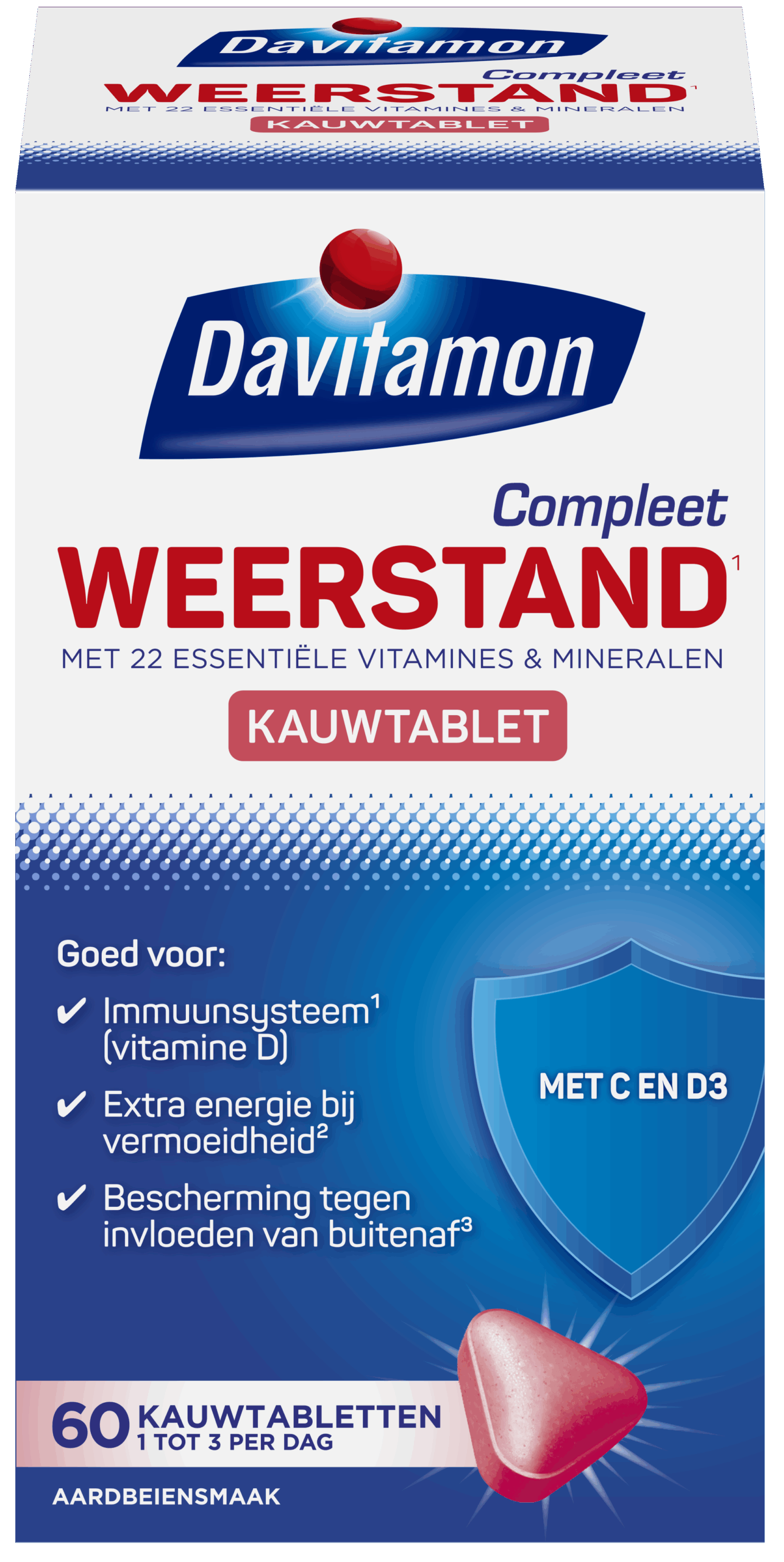 Een goede weerstand is belangrijk voor je gezondheid. Voor een goede weerstand is het essentieel dat je dagelijks voldoende vitamines en mineralen binnenkrijgt. Davitamon Compleet Weerstand bevat ter aanvulling op de voeding alle belangrijke vitamines en mineralen die je immuunsysteem ondersteunen (vitamine A, B6, B11, B12, C, koper, selenium, ijzer en zink) en extra vitamine D. Het kan daarom extra ondersteuning bieden in de donkere koude maanden, maar is ook goed te gebruiken voor extra ondersteuning bij lichamelijke inspanning of in herstelperiodes.
