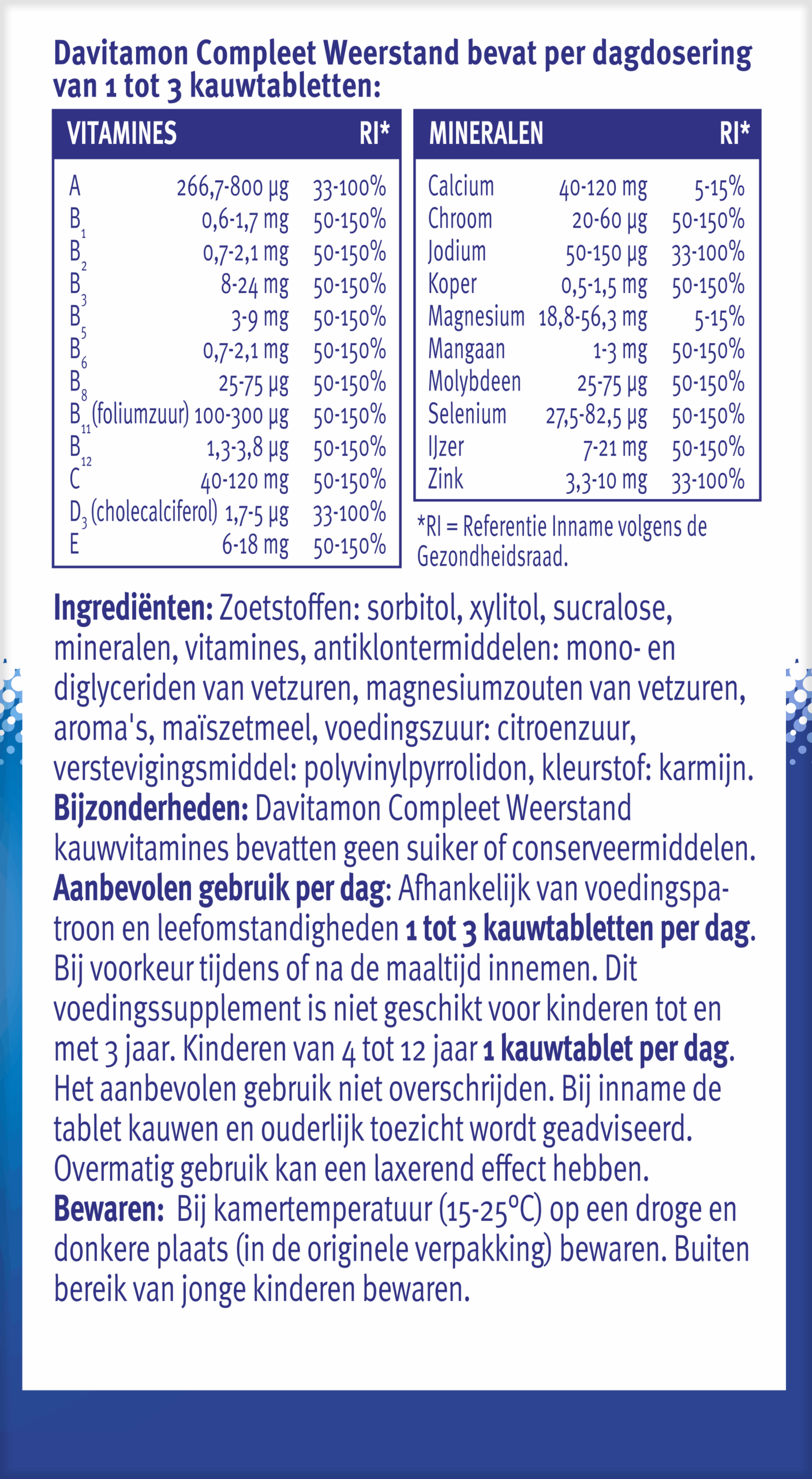 Davitamon Compleet Weerstand is een voedingssupplement met zoetstoffen van Omega Pharma Nederland B.V. Rotterdam. Een gezonde levensstijl is belangrijk, evenals een gevarieerde, evenwichtige voeding, waarvoor voedingssupplementen geen vervanging zijn. Dit voedingssupplement is niet geschikt voor kinderen tot en met 3 jaar.