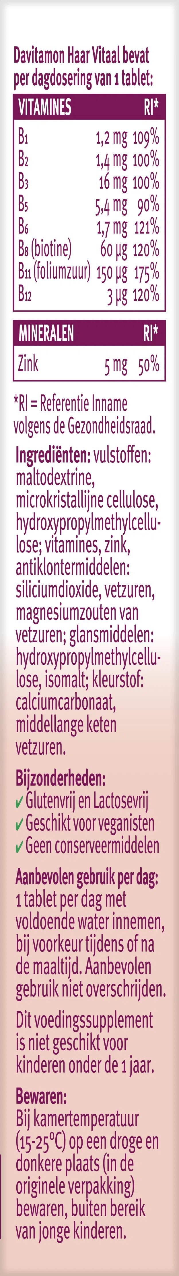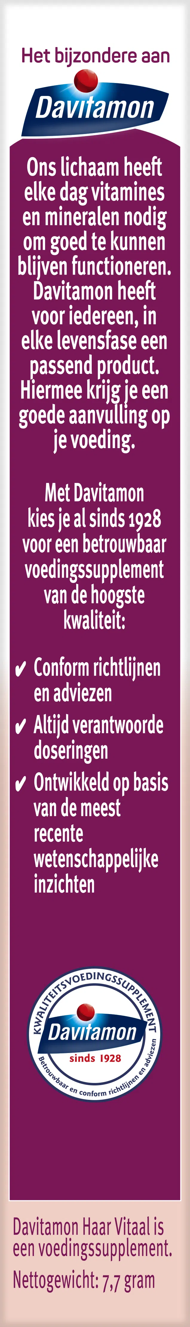 Davitamon Haar Vitaal is een voedingssupplement van Omega Pharma Nederland B.V. Rotterdam. Een gezonde levensstijl is belangrijk, evenals een gevarieerde, evenwichtige voeding, waarvoor voedingssupplementen geen vervanging zijn.