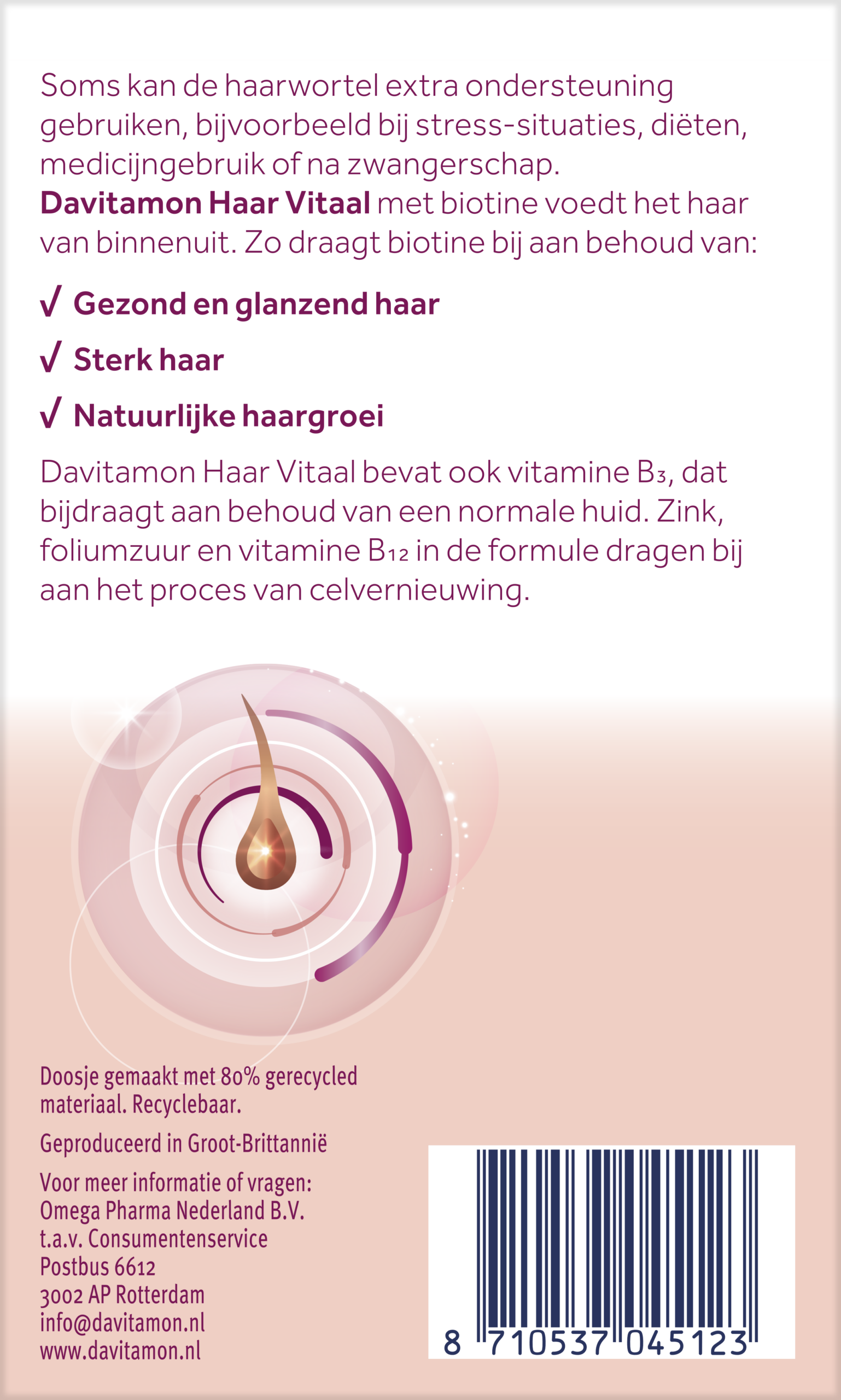 - Ondersteunt de natuurlijke haargroei (biotine)