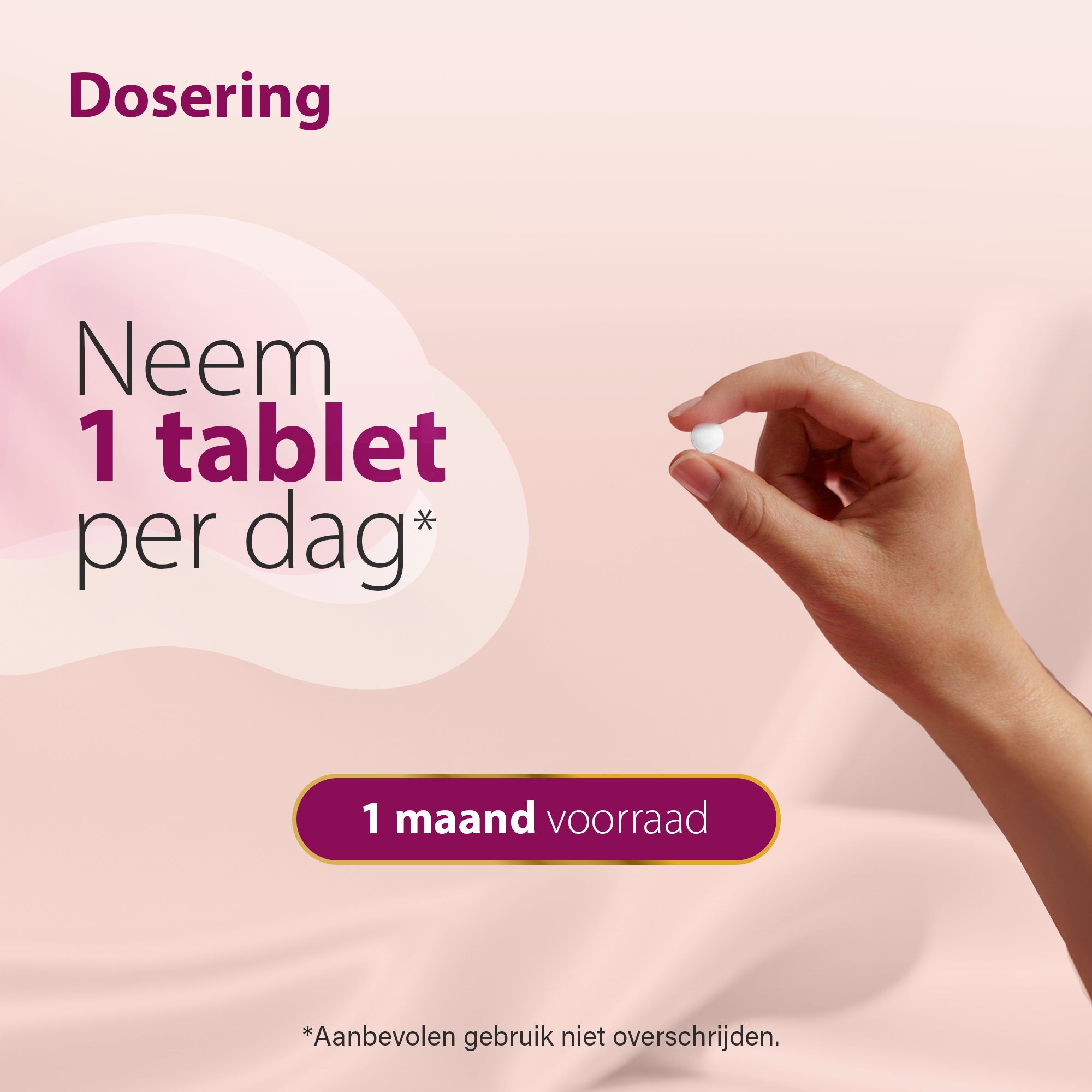 1 tablet per dag met voldoende water innemen, bij voorkeur tijdens of na de maaltijd. Aanbevolen gebruik niet overschrijden.