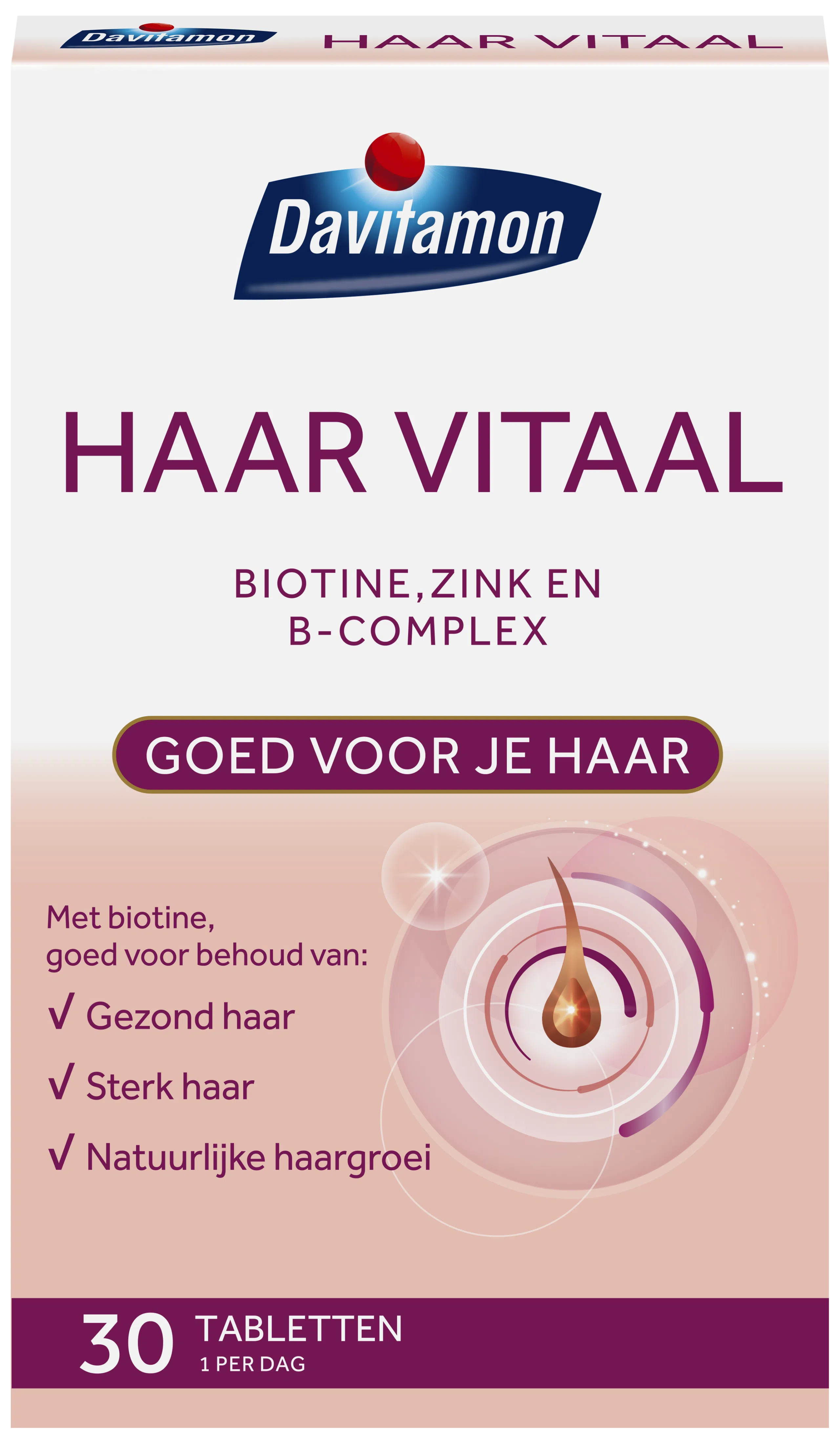 Soms kan de haarwortel extra ondersteuning gebruiken, bijvoorbeeld bij stress- situaties, tijdens diëten, bij medicijngebruik of na een zwangerschap. Davitamon Haar Vitaal met biotine is speciaal ontwikkeld om het haar van binnenuit te voeden. Biotine draagt bij aan het behoud van gezond, glanzend en sterk haar en ondersteunt bovendien de natuurlijke haargroei.