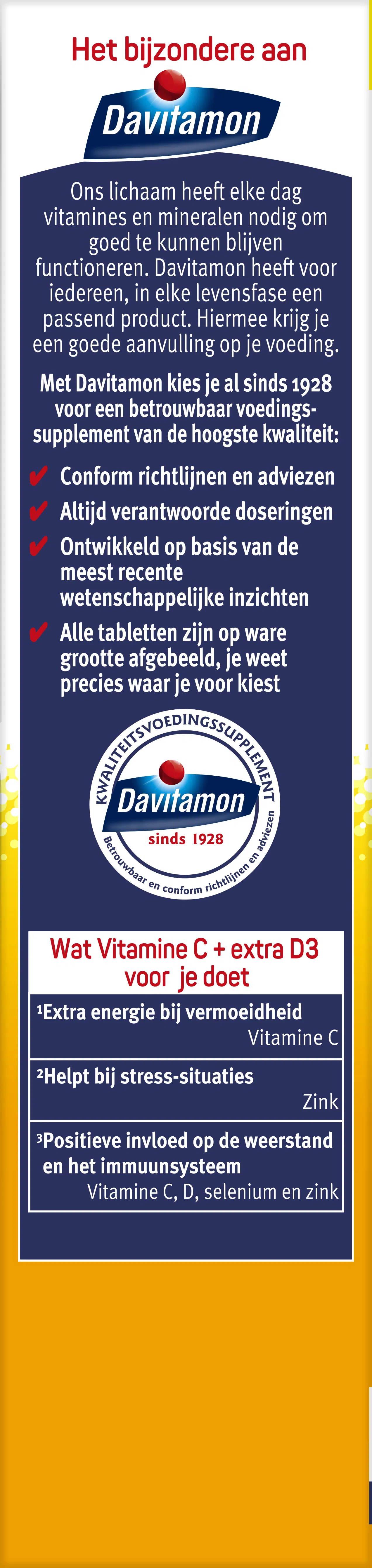 Davitamon Vitamine C Hoog gedoseerd + extra D3 bruistabletten is een voedingssupplement met zoetstoffen van Omega Pharma Nederland B.V. Rotterdam. Een gezonde levensstijl is belangrijk, evenals een gevarieerde, evenwichtige voeding, waarvoor voedingssupplementen geen vervanging zijn.