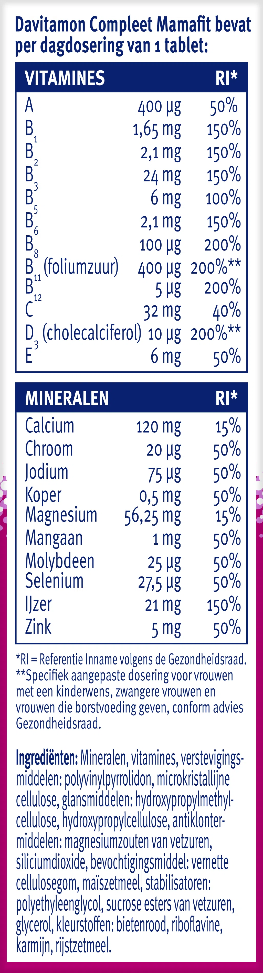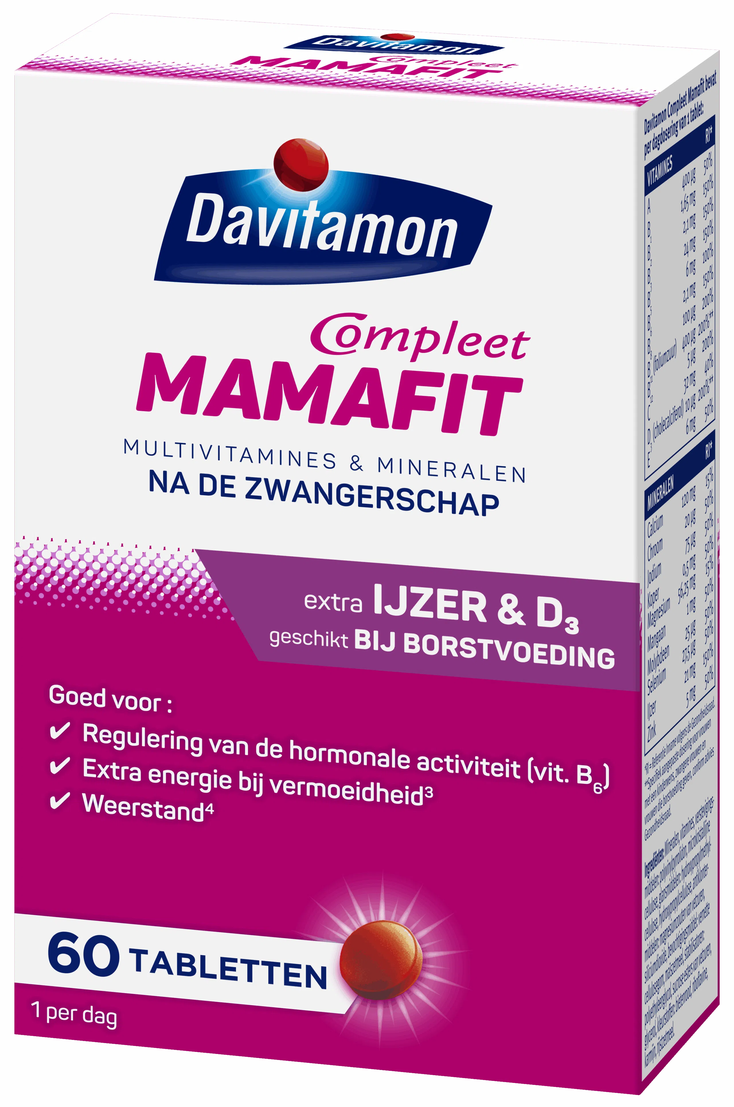 Voor de periode die aanbreekt na de zwangerschap combineert Davitamon MamaFit de belangrijkste vitamines en mineralen in één tablet per dag. De samenstelling helpt je om aan te sterken na de bevalling, je opnieuw fit te voelen en is goed voor de weerstand en het energieniveau. Davitamon MamaFit: zorg goed voor jezelf.