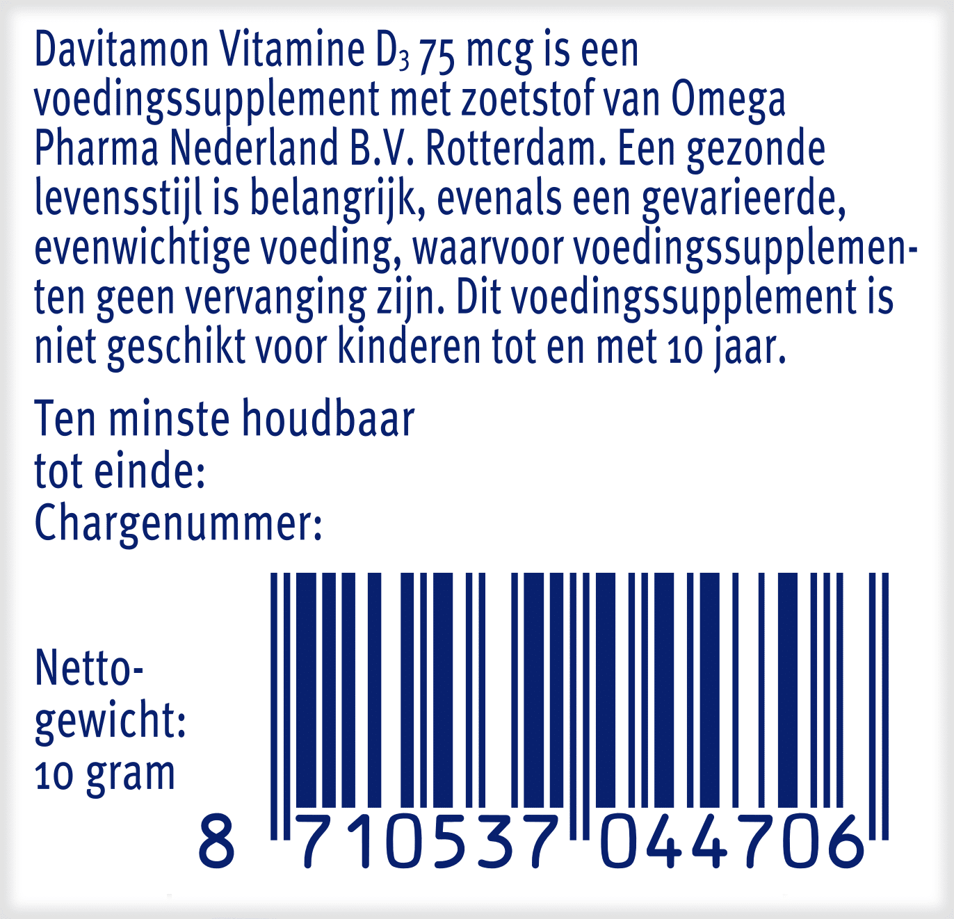 *RI = Referentie Inname volgens de Gezondheidsraad Davitamon Vitamine D is een voedingssupplement met zoetstof van Omega Pharma Nederland B.V. Rotterdam. Een gezonde levensstijl is belangrijk, evenals een gevarieerde, evenwichtige voeding, waarvoor voedingssupplementen geen vervanging zijn.